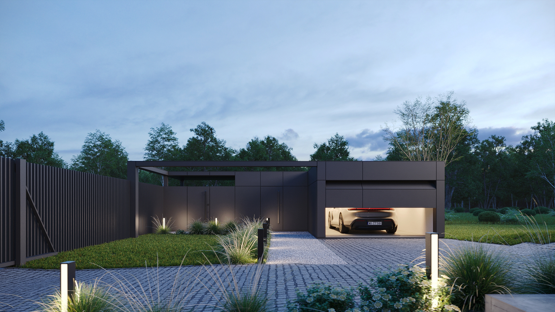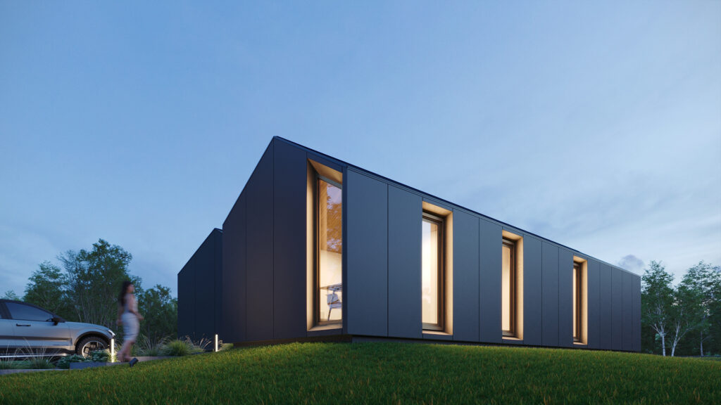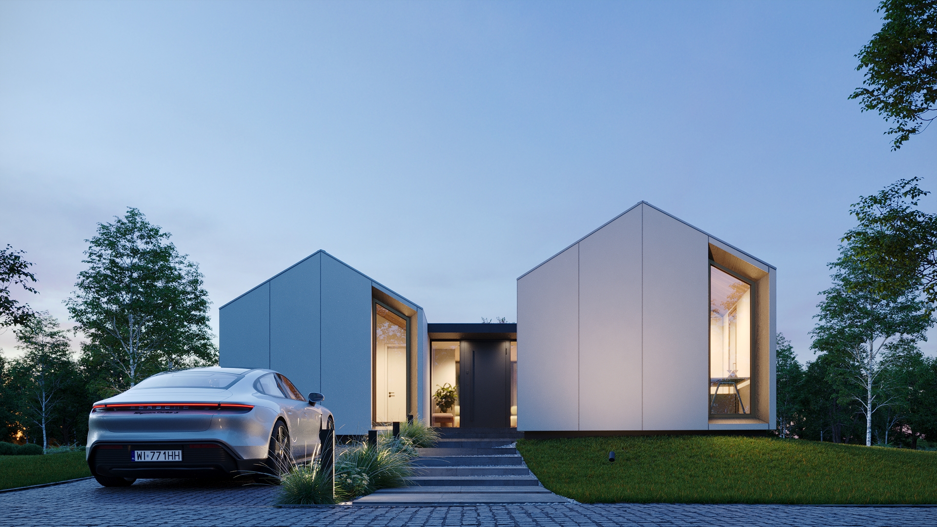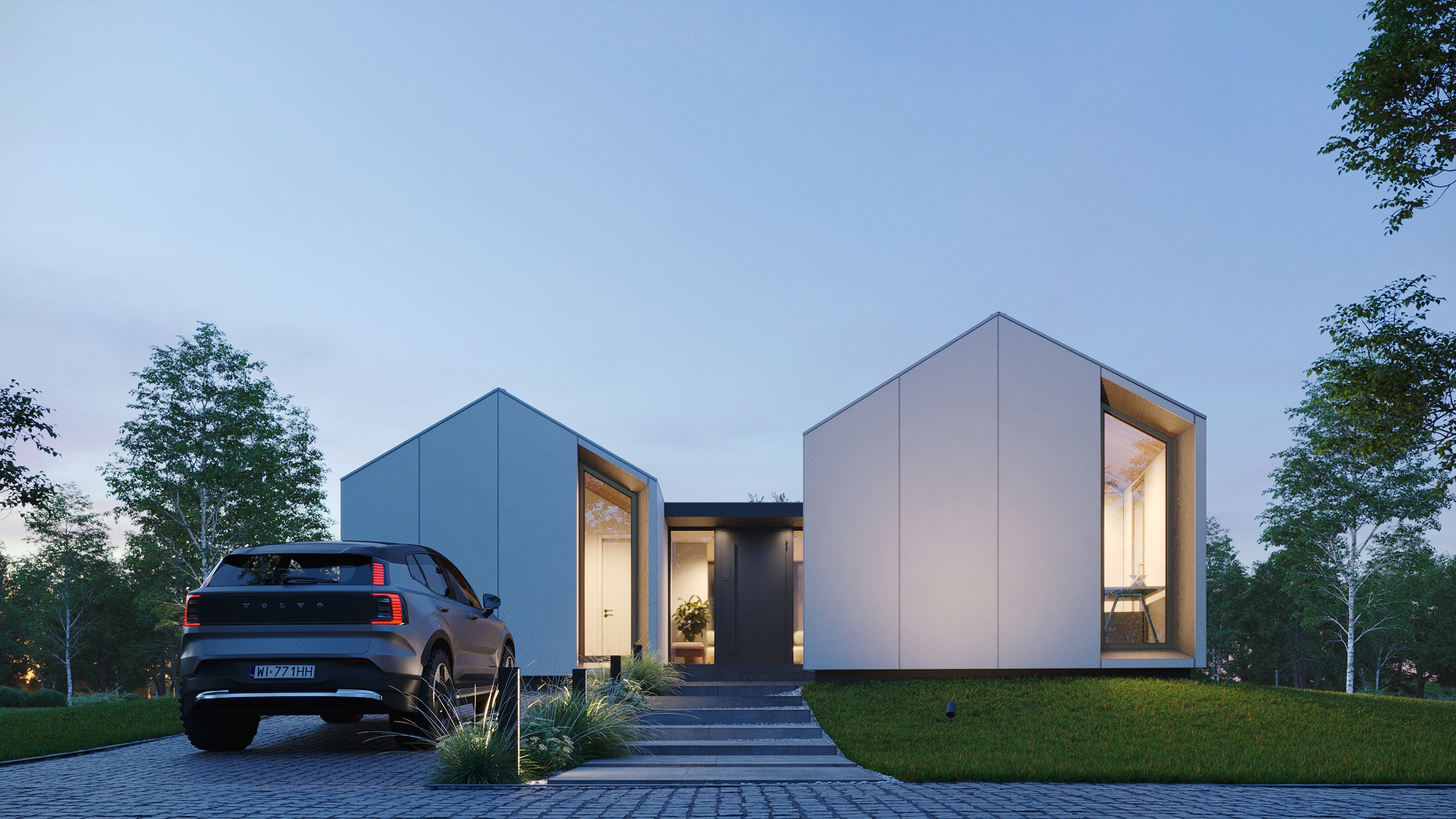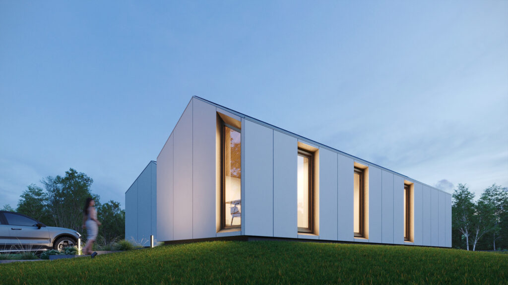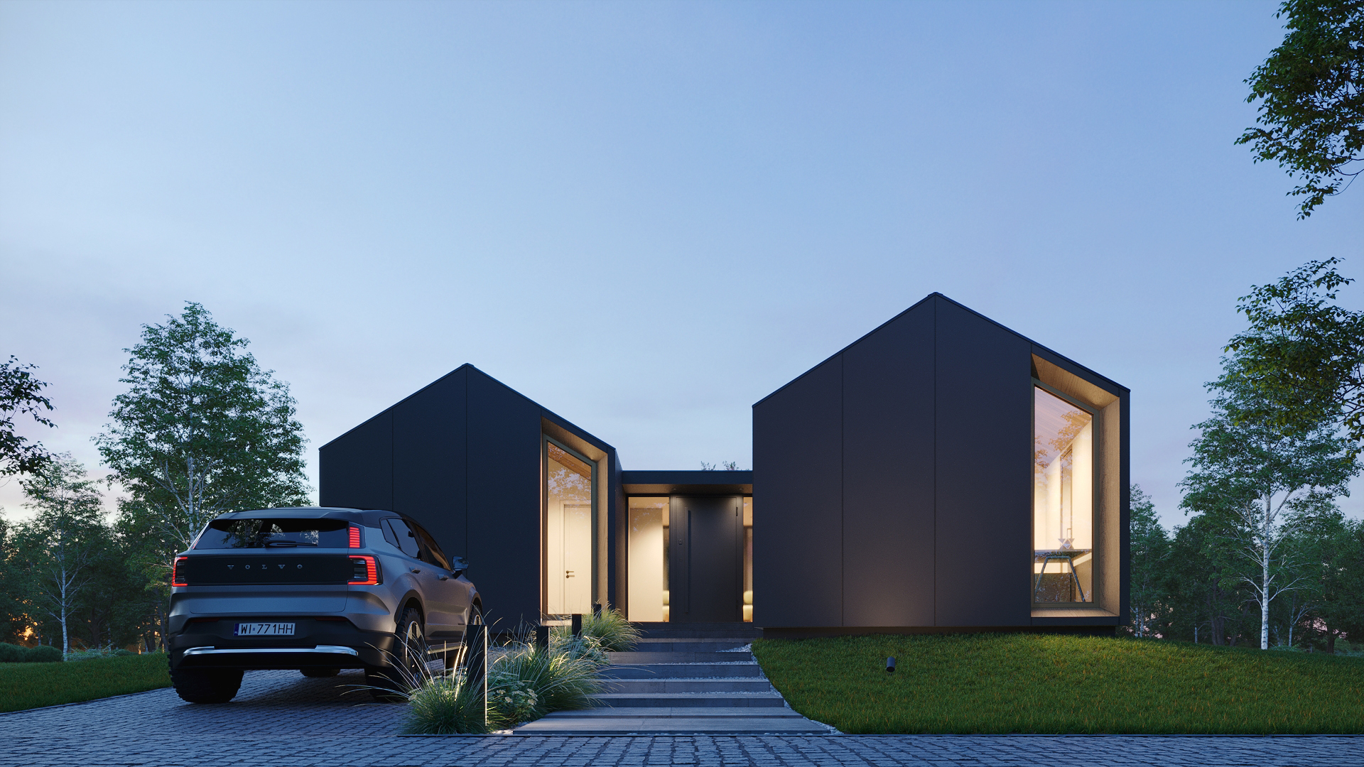NAURA 109m² to bryła złożona z trzech modułów oraz dużym narożnym przeszkleniem zapewniającym wyjątkowy wygląd. Nowoczesna dom składający się z dwóch głównych modułów z dachem 30° oraz łącznika z dachem płaskim. Budynek posiada funkcjonalnie rozplanowane wnętrze dzięki temu, że przestronna strefa dzienna oraz kuchnia połączone są łącznikiem tworząc jadalnie. Mamy do dyspozycji trzy niezależne sypialnie, 2 łazienki oraz przestronny hall wejściowy.