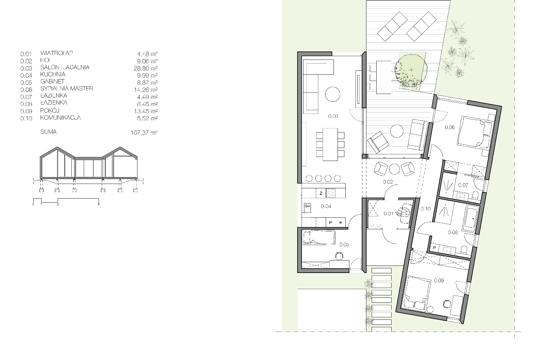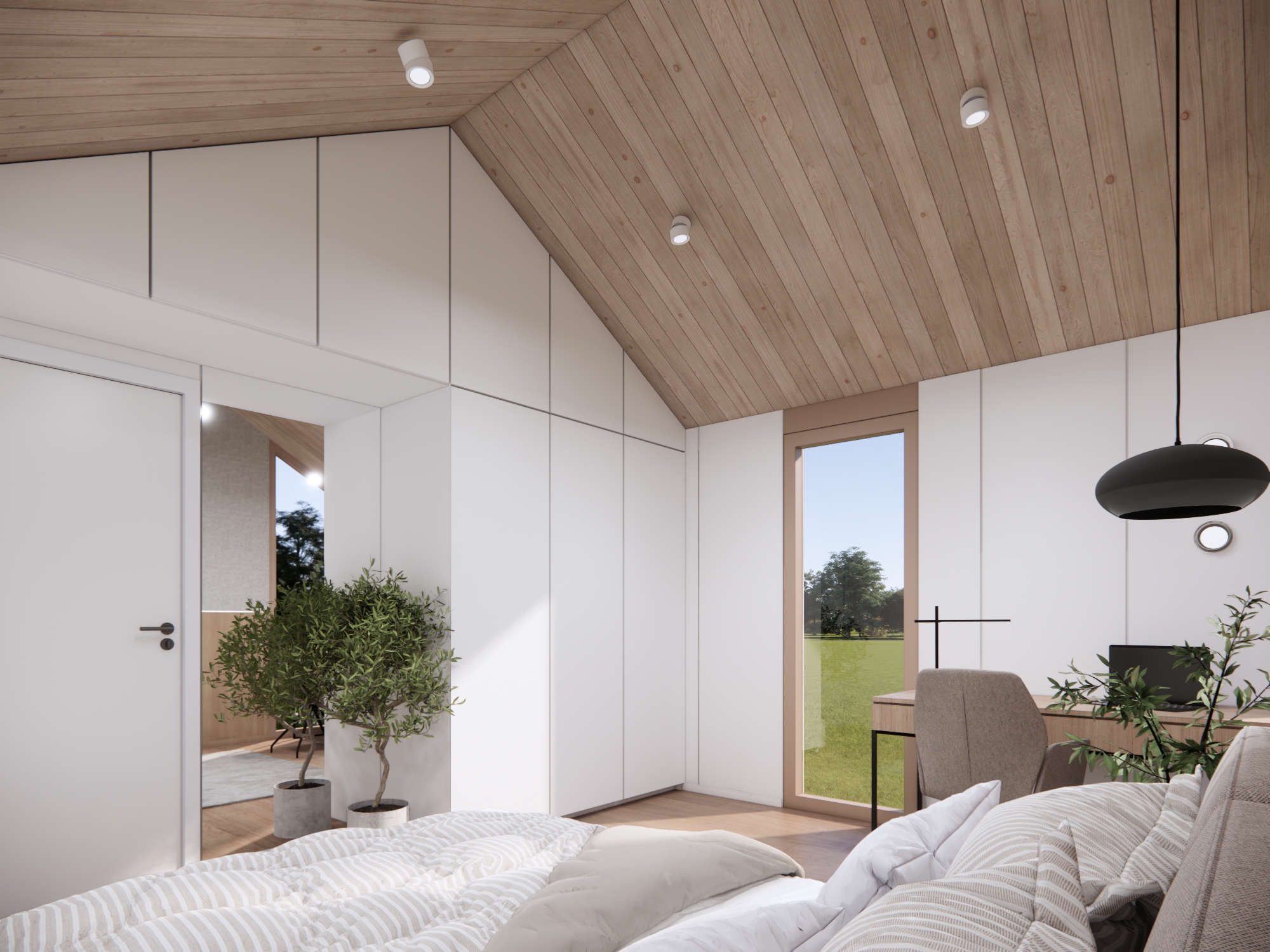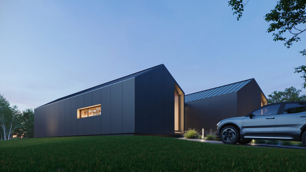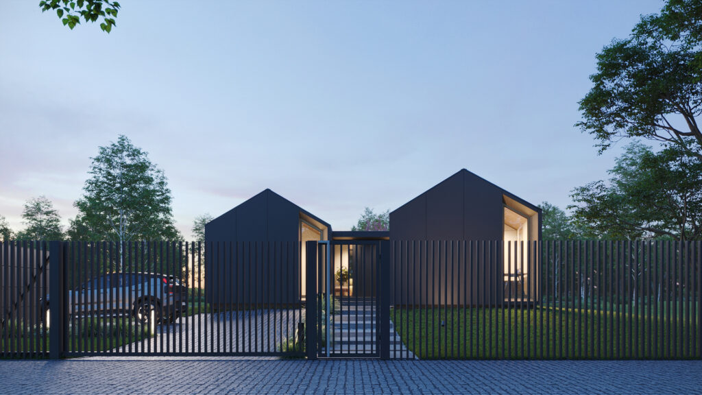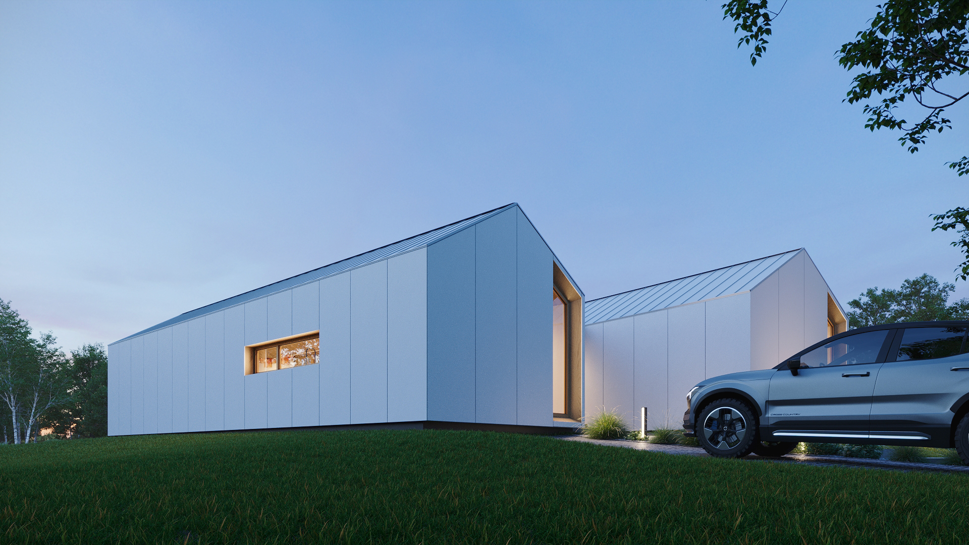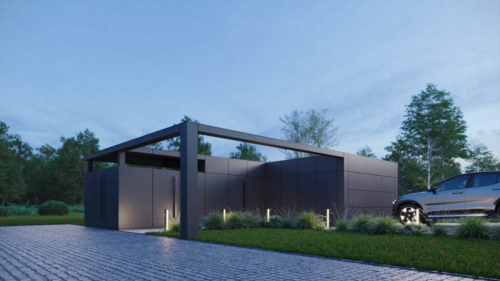 NAURA 109m² to bryła złożona z trzech modułów oraz dużym narożnym przeszkleniem zapewniającym wyjątkowy wygląd. Nowoczesna dom składający się z dwóch głównych modułów z dachem 30° oraz łącznika z dachem płaskim. Budynek posiada funkcjonalnie rozplanowane wnętrze dzięki temu, że przestronna strefa dzienna oraz kuchnia połączone są łącznikiem tworząc jadalnie. Mamy do dyspozycji trzy niezależne sypialnie, 2 łazienki oraz przestronny hall wejściowy.