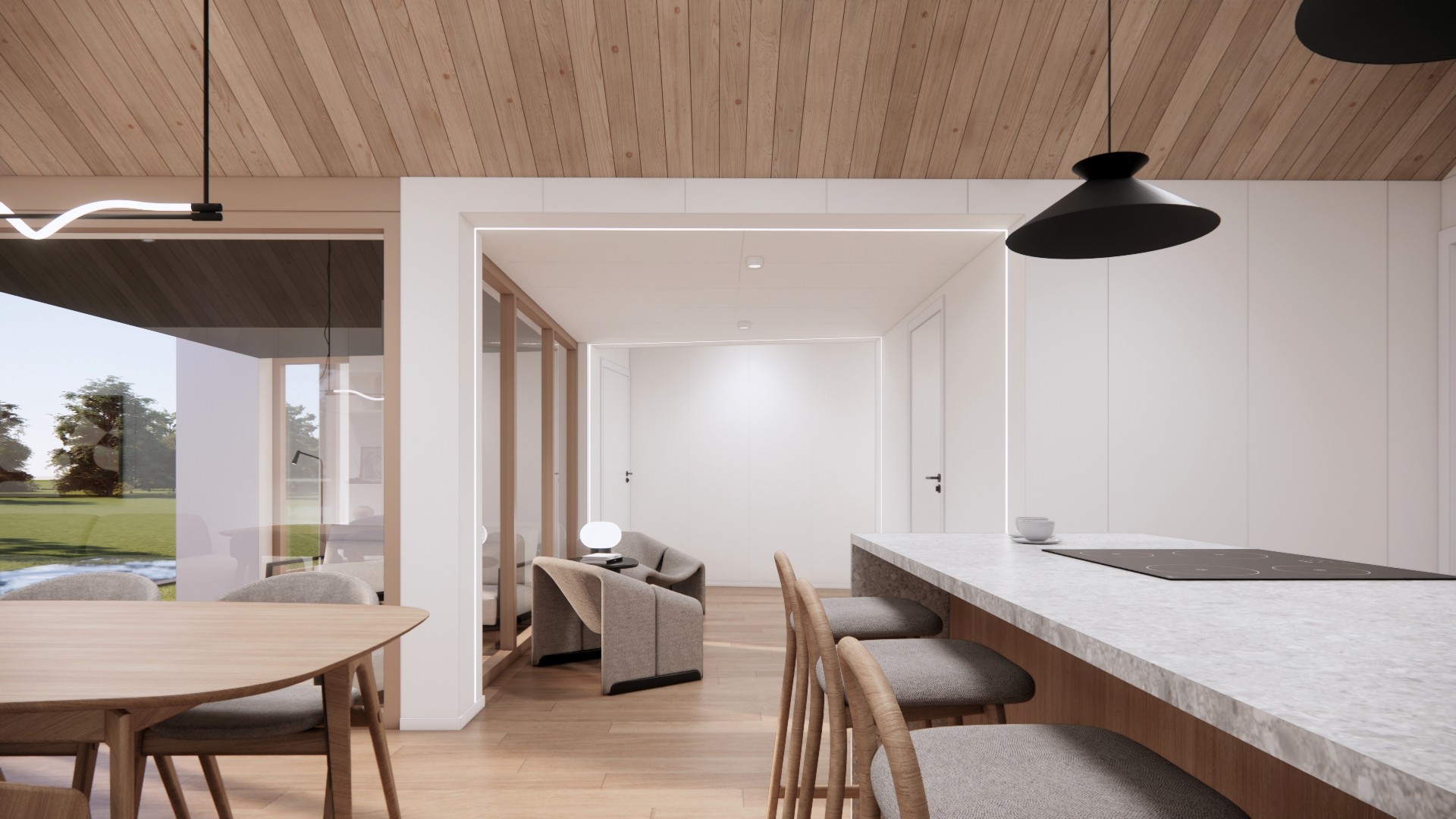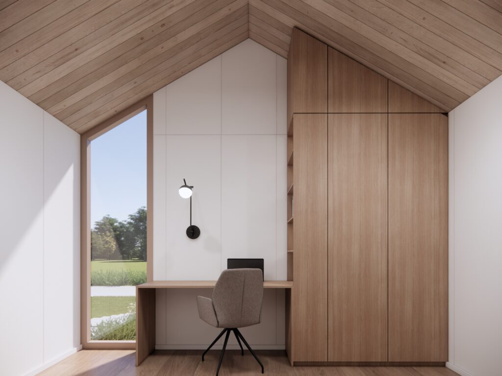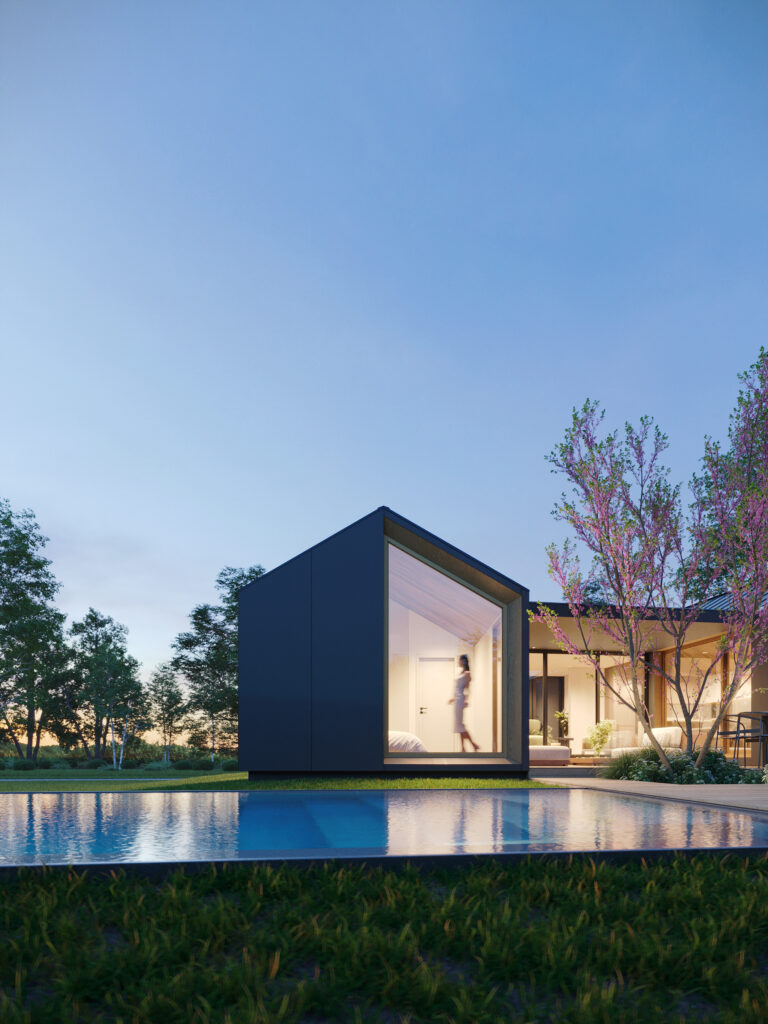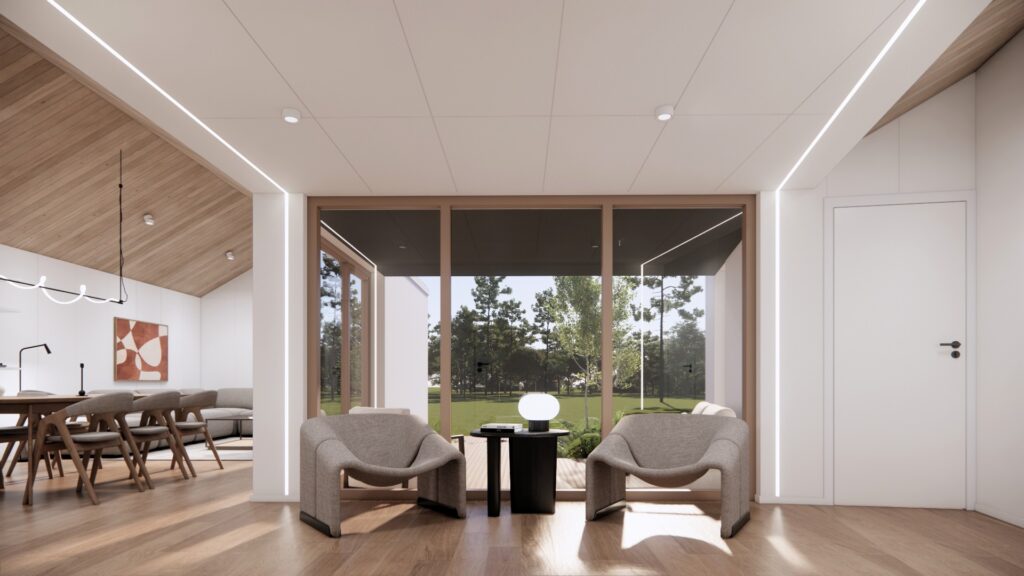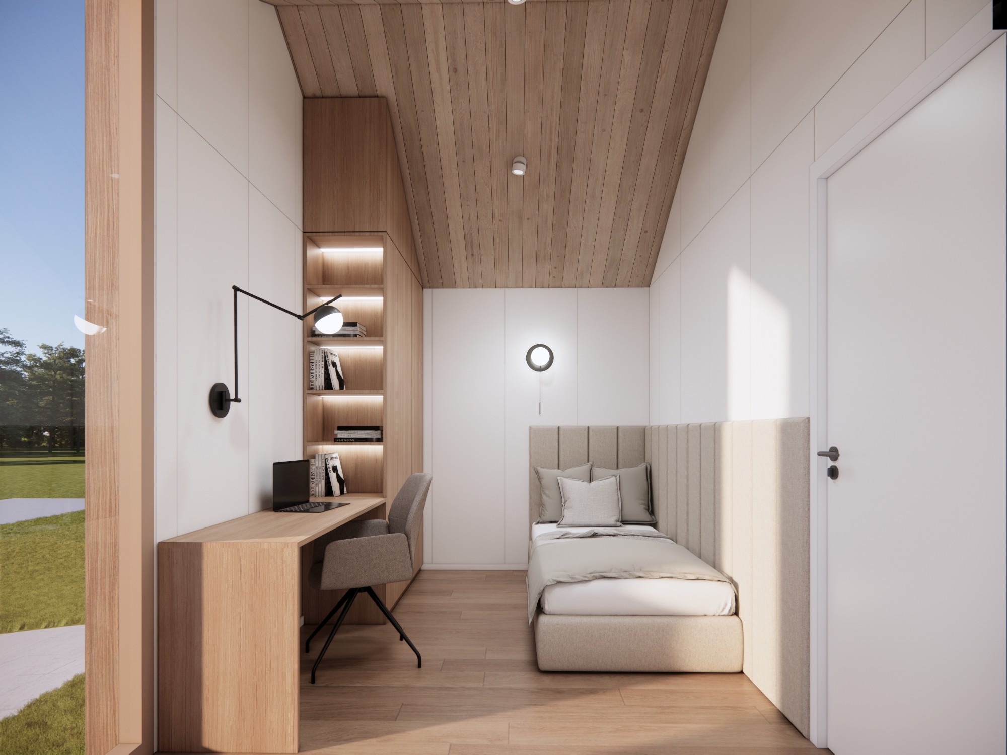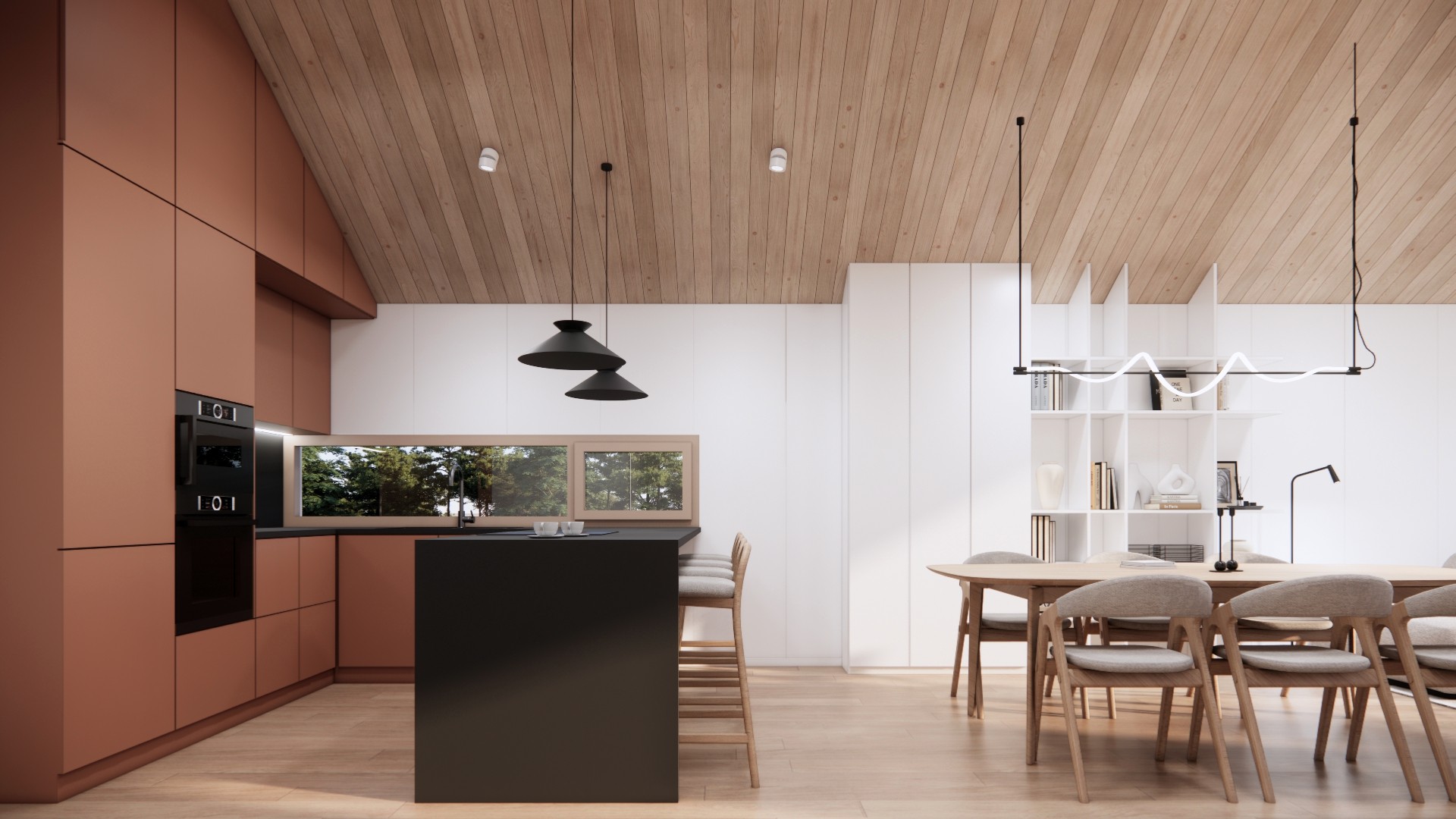 NAURA 109m² to bryła złożona z trzech modułów oraz dużym narożnym przeszkleniem zapewniającym wyjątkowy wygląd. Nowoczesna dom składający się z dwóch głównych modułów z dachem 30° oraz łącznika z dachem płaskim. Budynek posiada funkcjonalnie rozplanowane wnętrze dzięki temu, że przestronna strefa dzienna oraz kuchnia połączone są łącznikiem tworząc jadalnie. Mamy do dyspozycji trzy niezależne sypialnie, 2 łazienki oraz przestronny hall wejściowy.