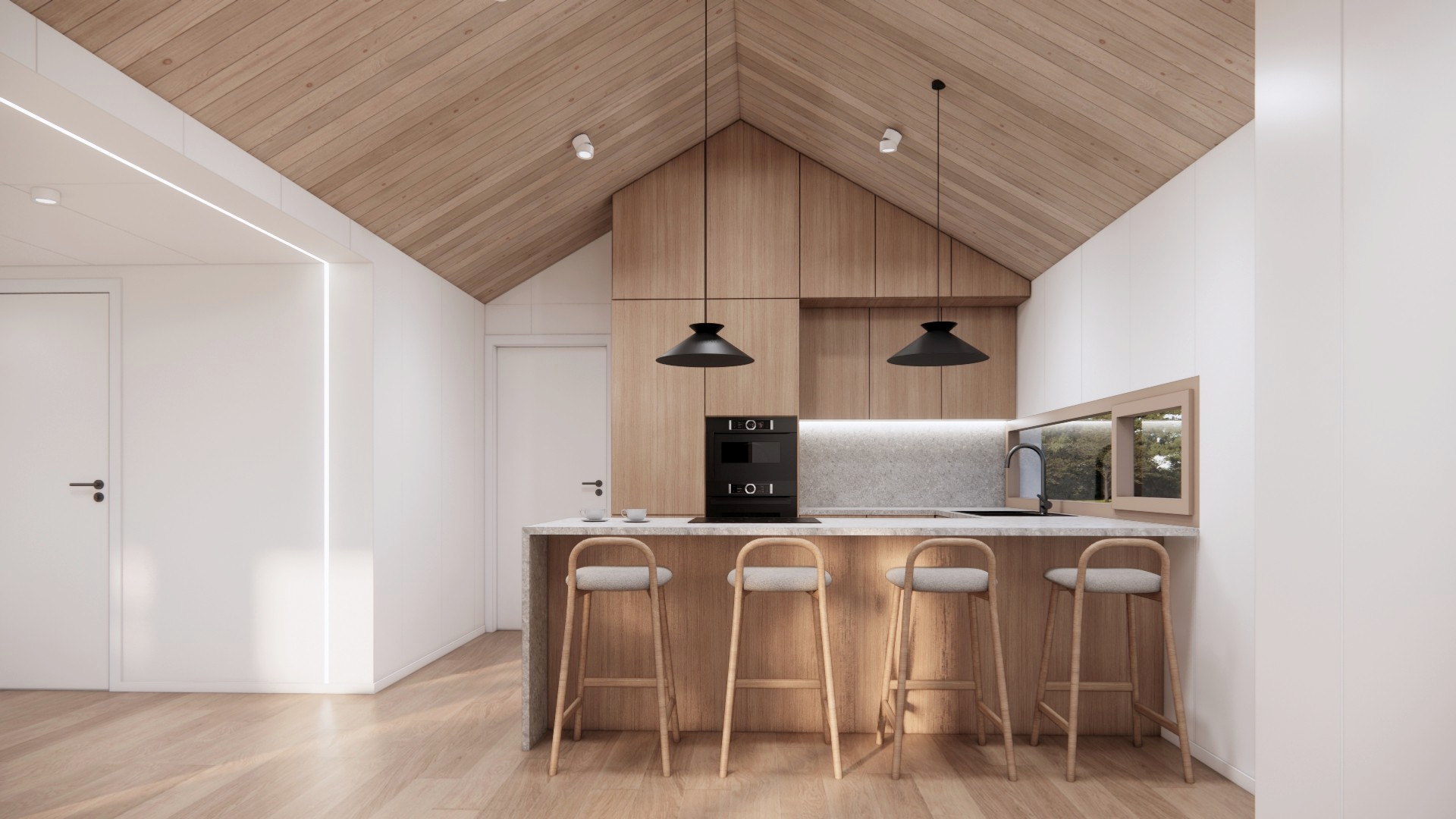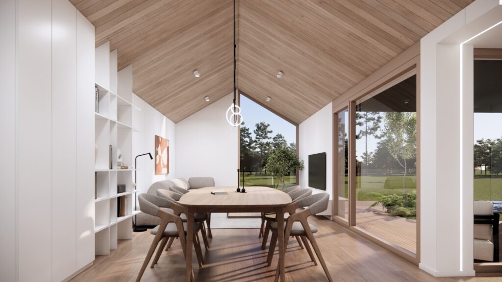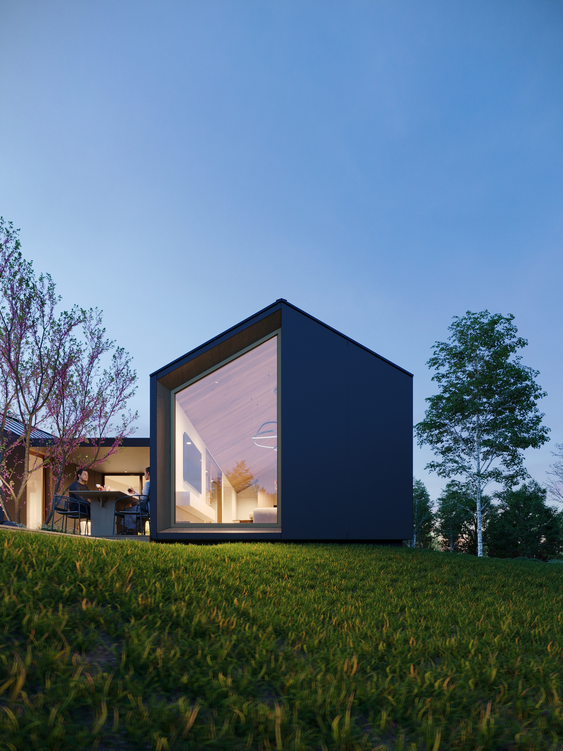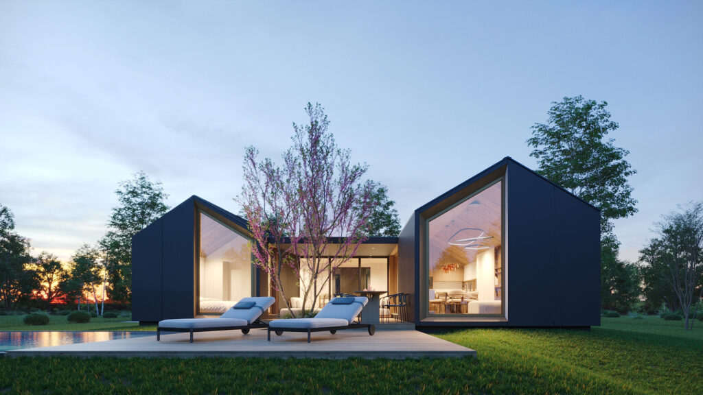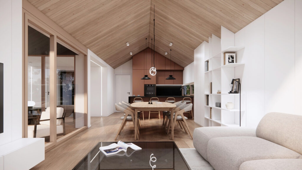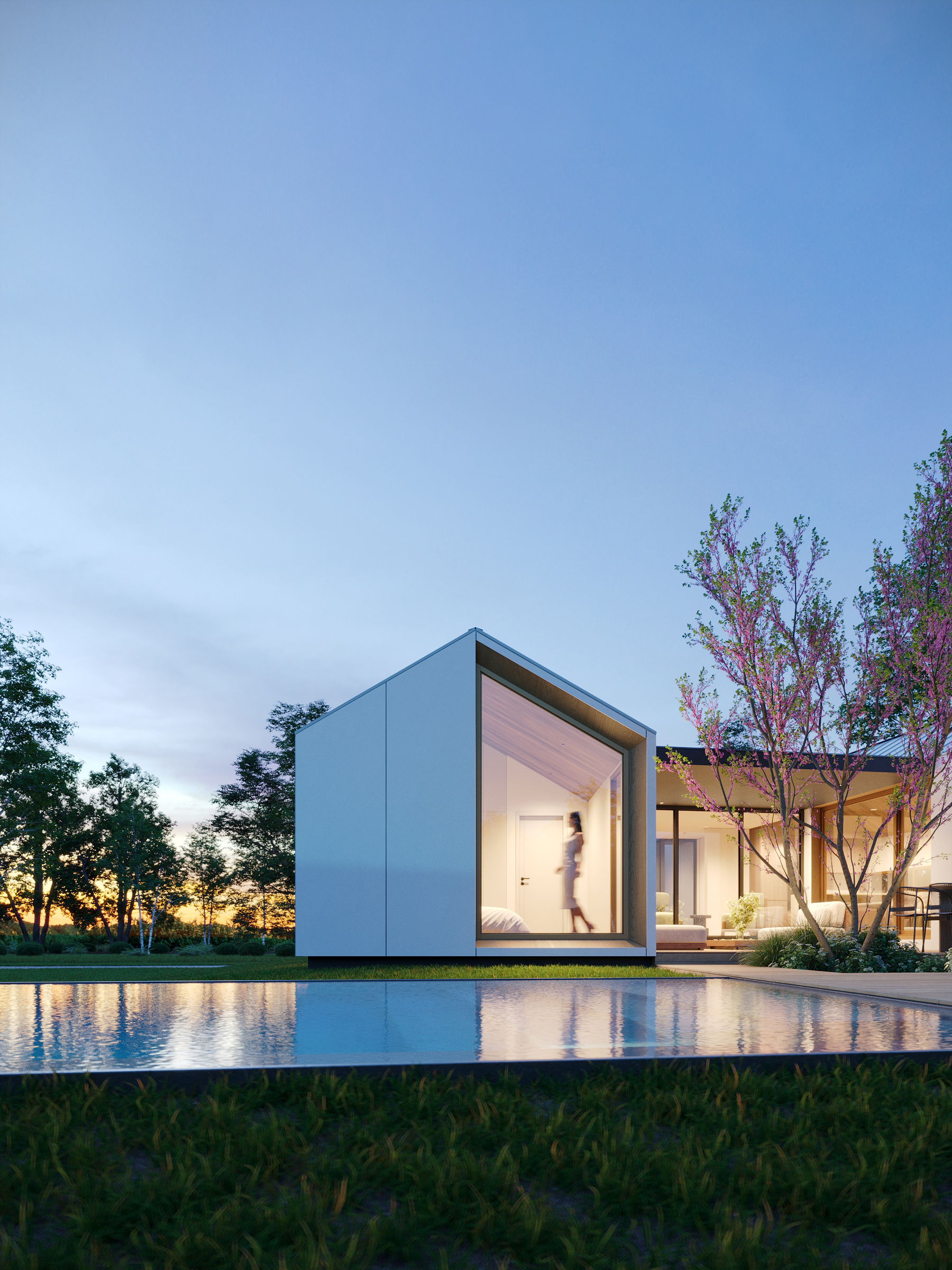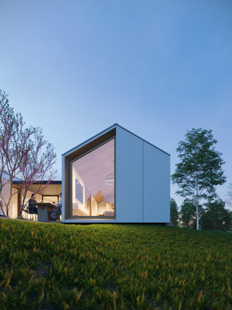 NAURA 109m² to bryła złożona z trzech modułów oraz dużym narożnym przeszkleniem zapewniającym wyjątkowy wygląd. Nowoczesna dom składający się z dwóch głównych modułów z dachem 30° oraz łącznika z dachem płaskim. Budynek posiada funkcjonalnie rozplanowane wnętrze dzięki temu, że przestronna strefa dzienna oraz kuchnia połączone są łącznikiem tworząc jadalnie. Mamy do dyspozycji trzy niezależne sypialnie, 2 łazienki oraz przestronny hall wejściowy.