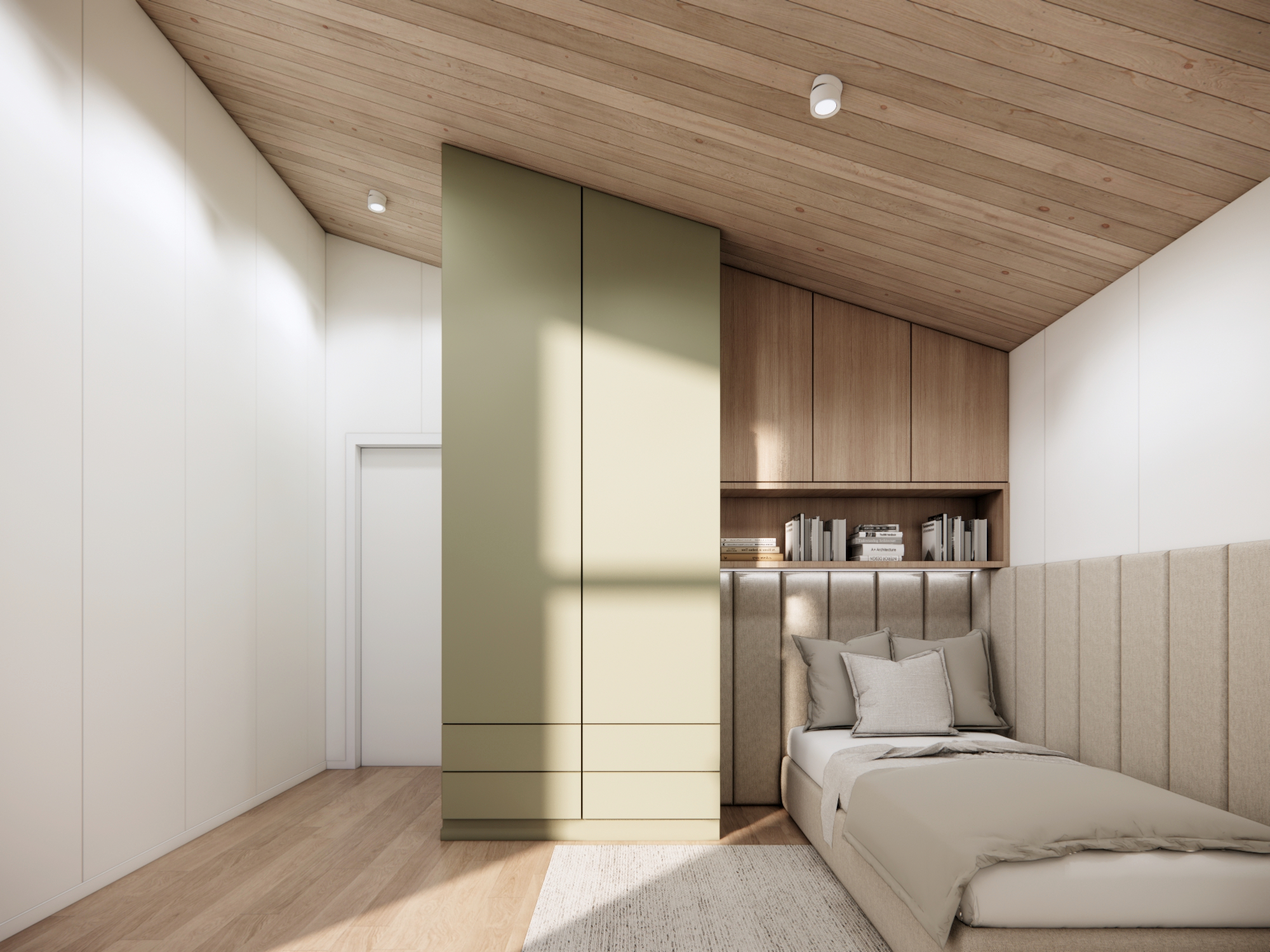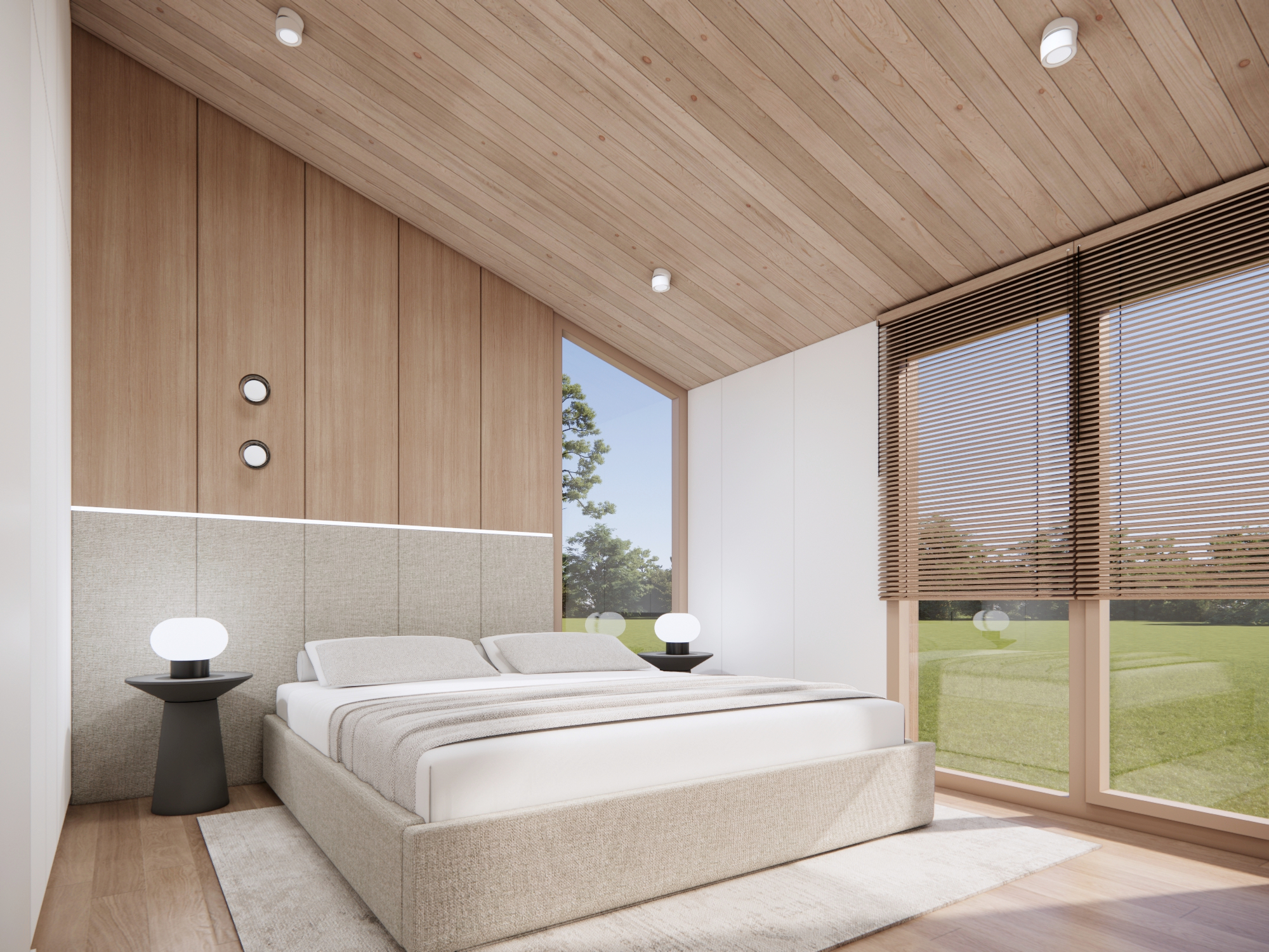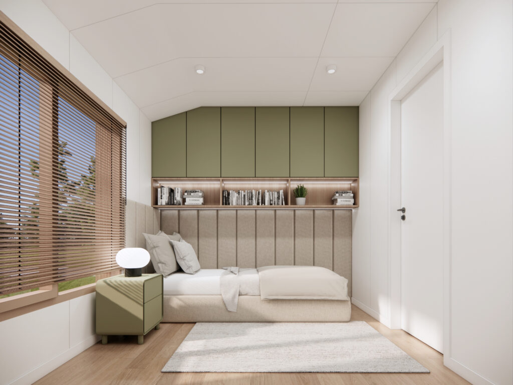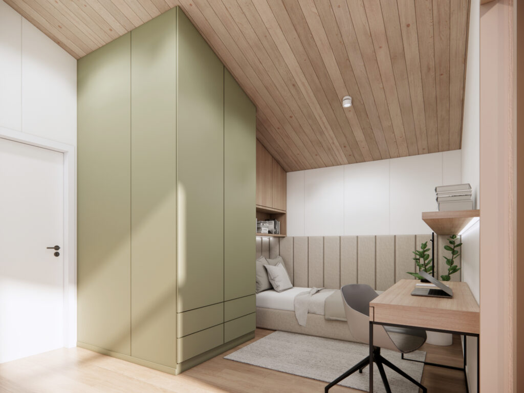 • zabudowa meblowa w sypialniach - dekoracyjna ściana z elementami tapicerowanymi wezgłowia oraz szafy w zabudowie