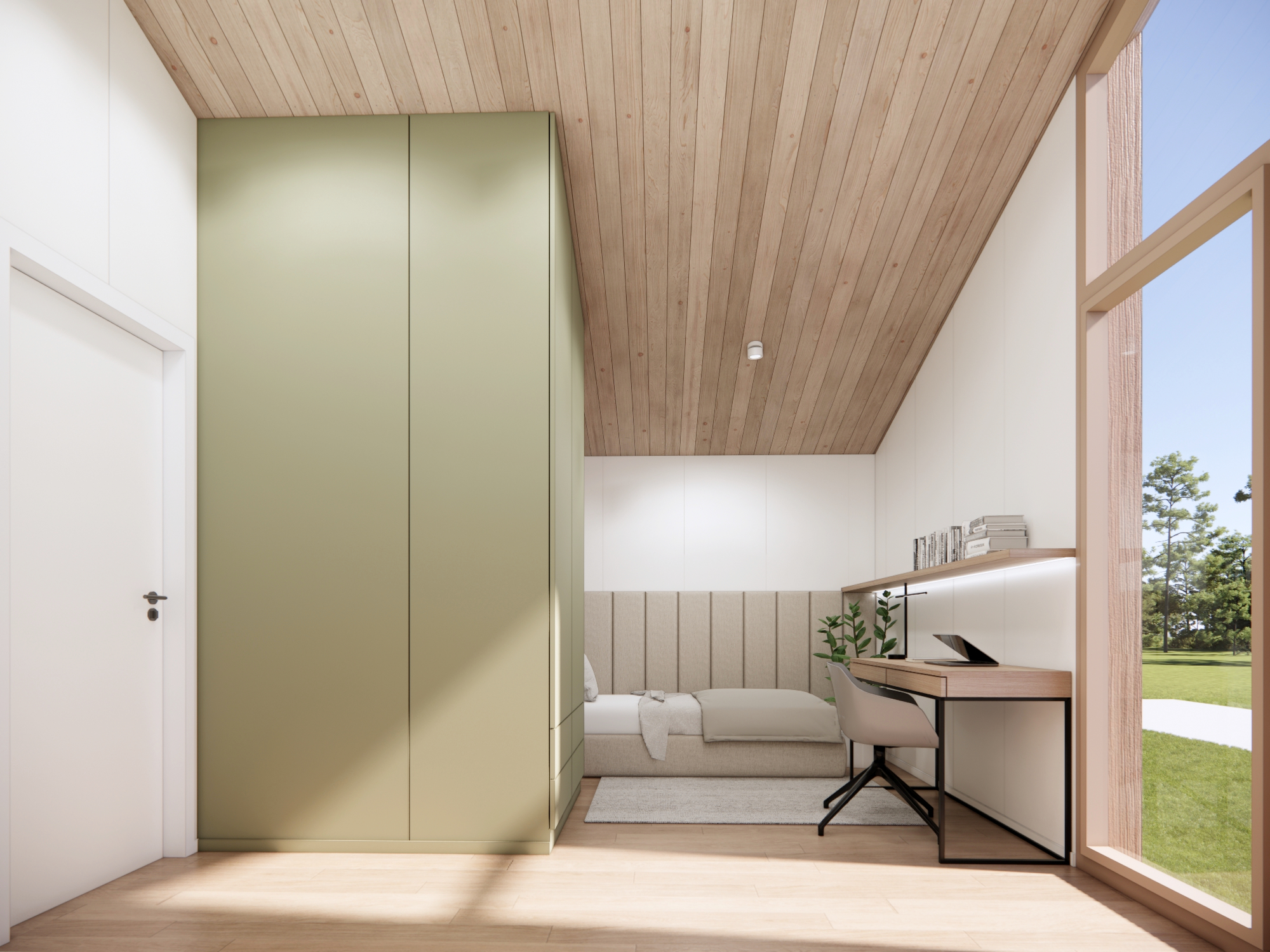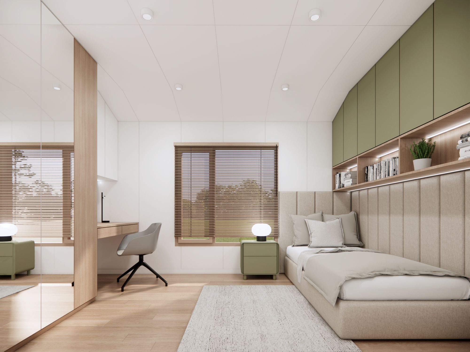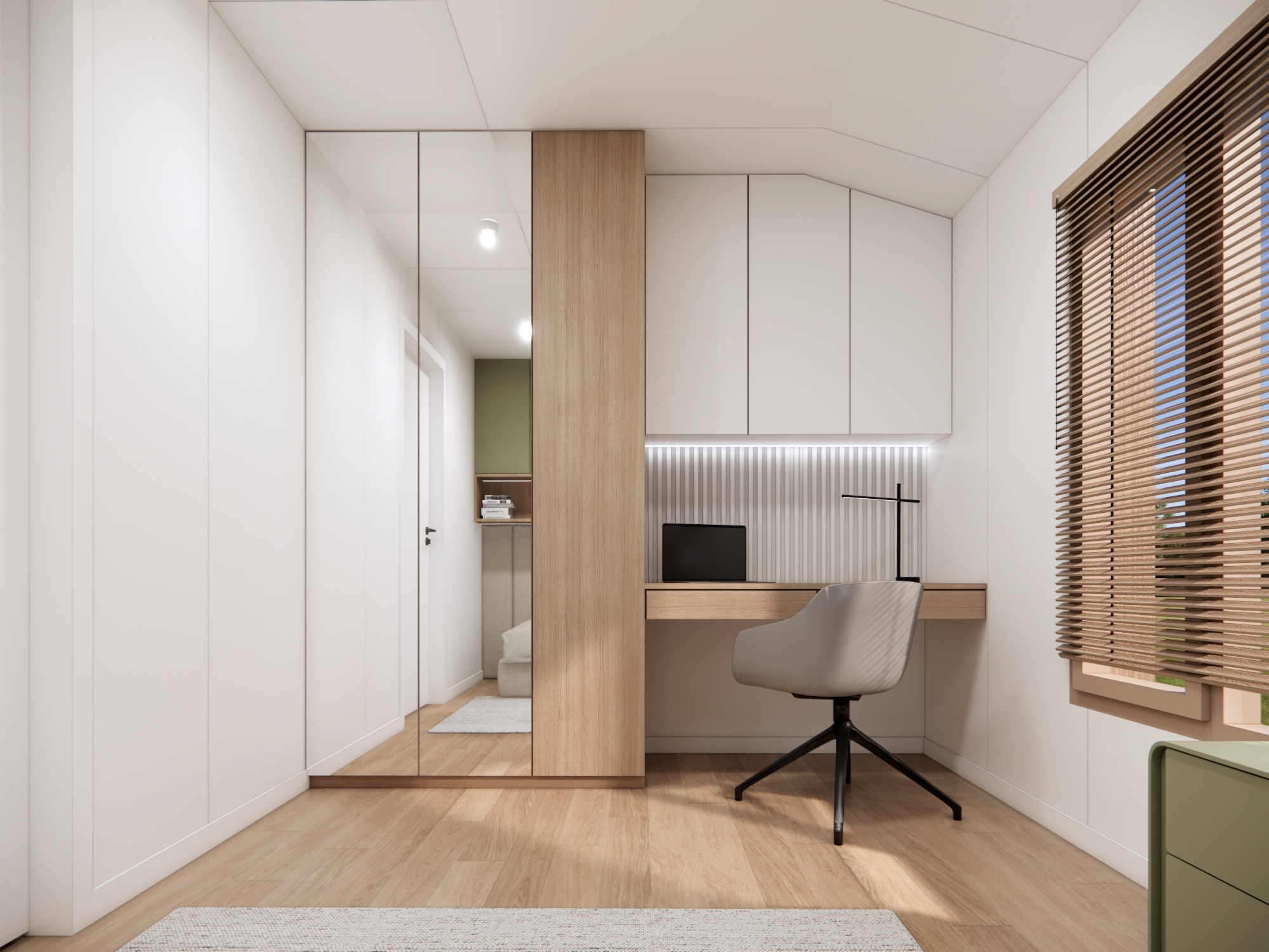• zabudowa meblowa w sypialniach - dekoracyjna ściana z elementami tapicerowanymi wezgłowia oraz szafy w zabudowie
