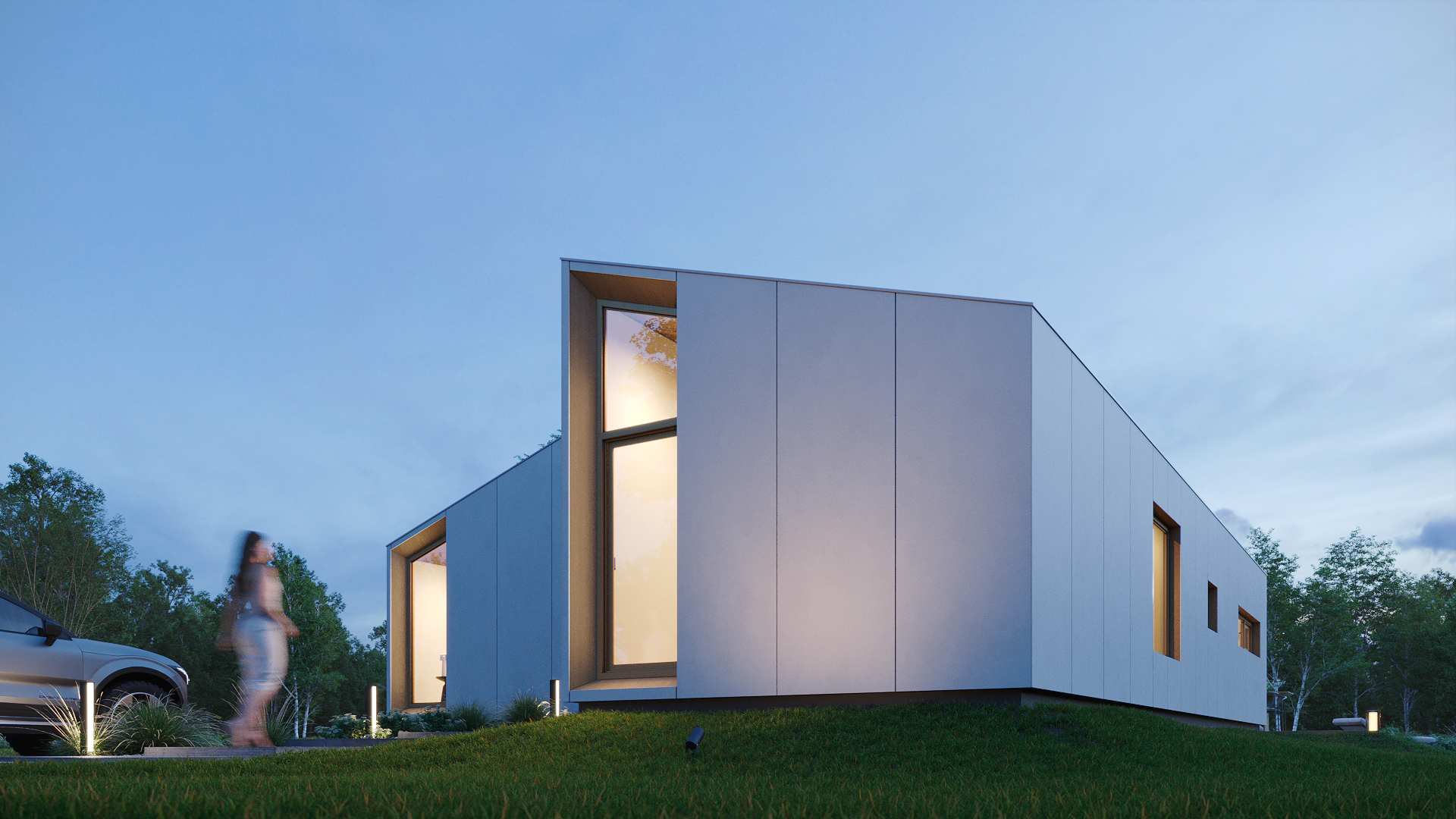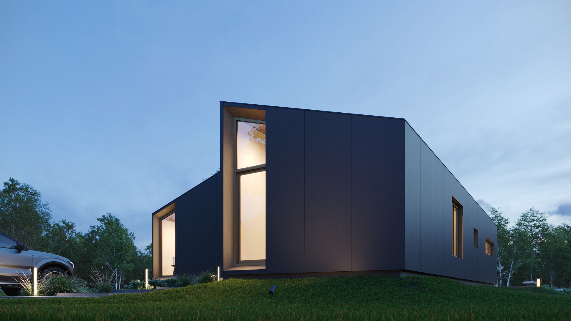 NAURA 109m² to bryła złożona z trzech modułów oraz dużym narożnym przeszkleniem zapewniającym wyjątkowy wygląd. Nowoczesna dom składający się z dwóch głównych modułów z dachem 30° oraz łącznika z dachem płaskim. Budynek posiada funkcjonalnie rozplanowane wnętrze dzięki temu, że przestronna strefa dzienna oraz kuchnia połączone są łącznikiem tworząc jadalnie. Mamy do dyspozycji trzy niezależne sypialnie, 2 łazienki oraz przestronny hall wejściowy.