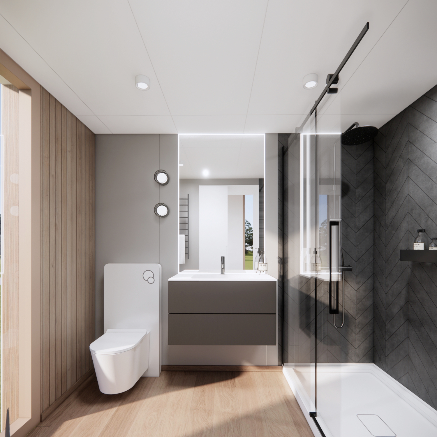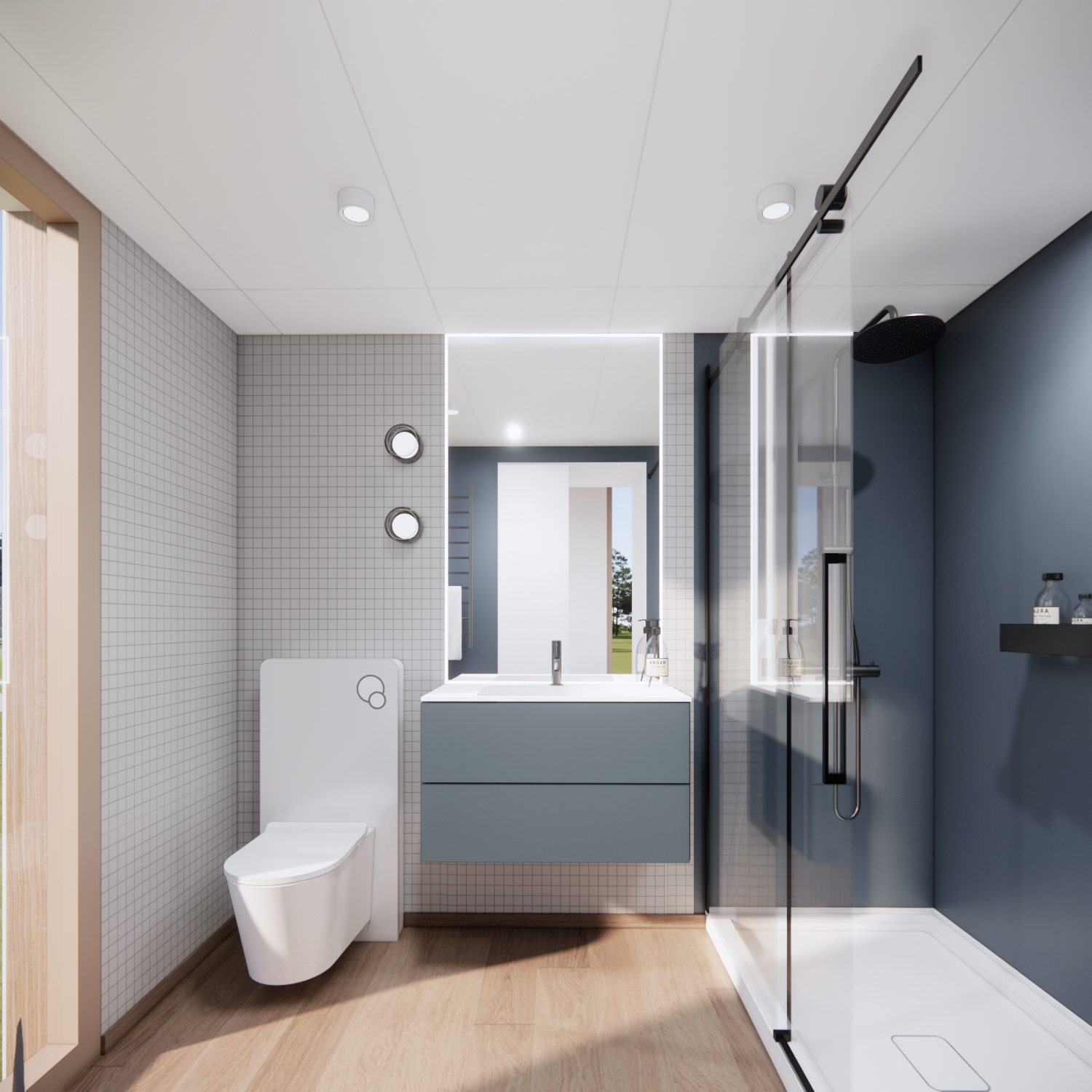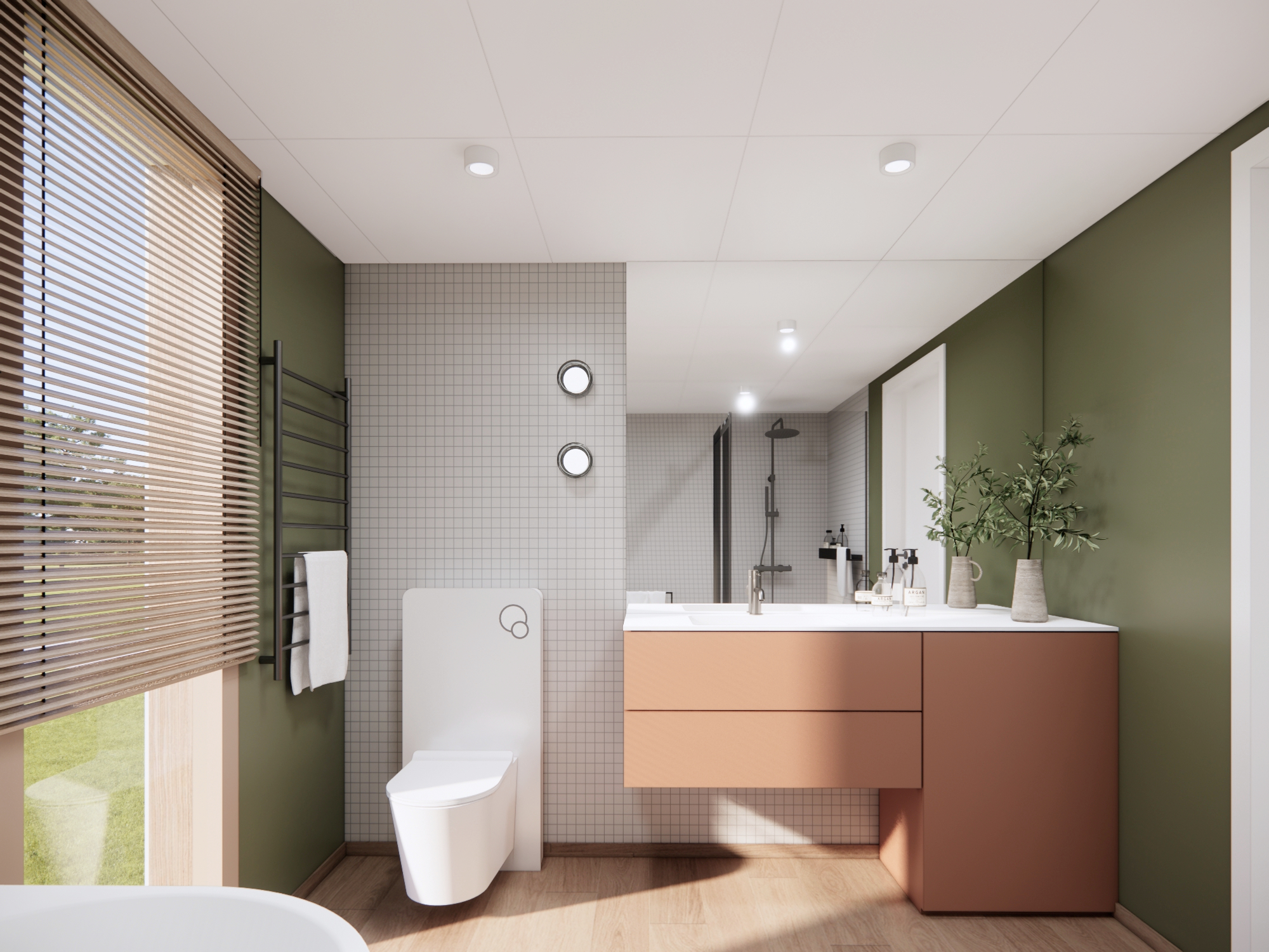 W pełni wykończone obie łazienki, z brodzikiem walk-in oraz szybą; szafką z umywalką i baterią, WC w zabudowie, podłoga wyłożona panelami LVT wraz z ogrzewaniem podłogowym, dodatkowy grzejnik drabinkowy. Sufit oraz ściany wykończony płytami norweskiego producenta Fibo.